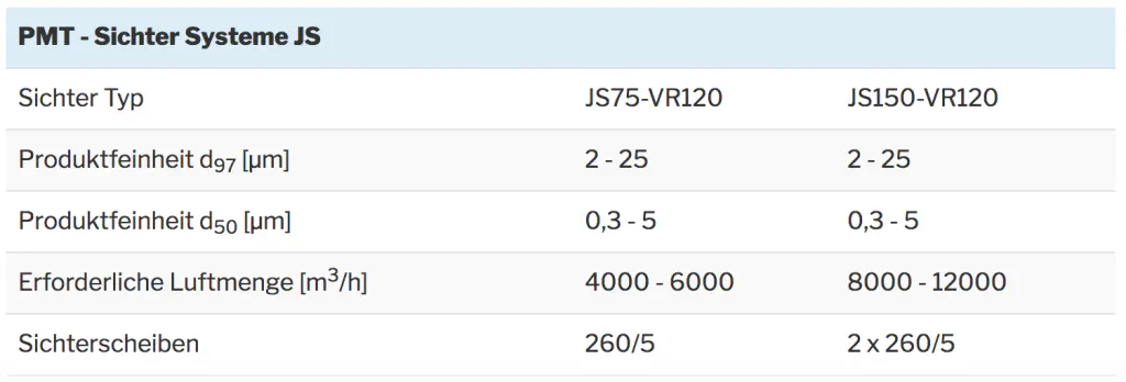 Starke Agglomeratbildung aufgrund hoher Oberflächenkräfte hat zur Folge, dass übliche Sichtsysteme nur ein geringes Inhaltsausbringen und somit Effizienz bei den feinen Anteilen des Aufgabematerials aufweisen. Deshalb hat die PMT-Jetmill GmbH die Sichter der JS-Serie entwickelt, die im Überdruckbereich und mit hohen Scherkräften arbeiten. Aufgrund dieser besonderen Arbeitsweise ist mit den Sichtern der PMT JS-Serie auch bei feinen und feinsten Produkten ein hohes Inhaltsausbringen bei großtechnischen Durchsatzleistungen realisierbar.